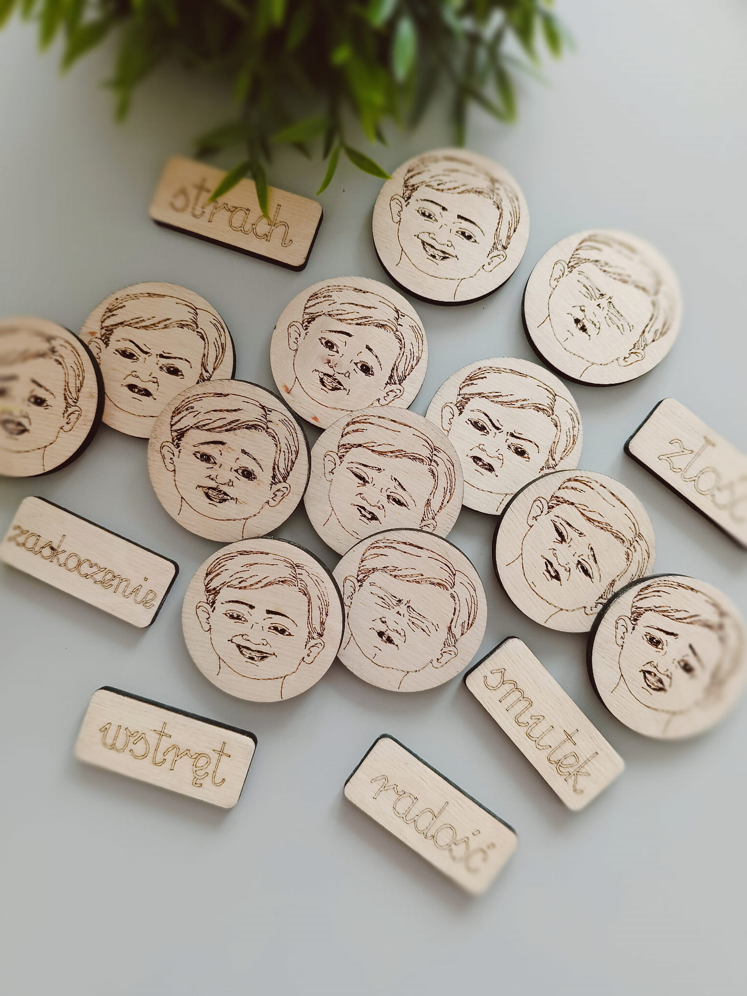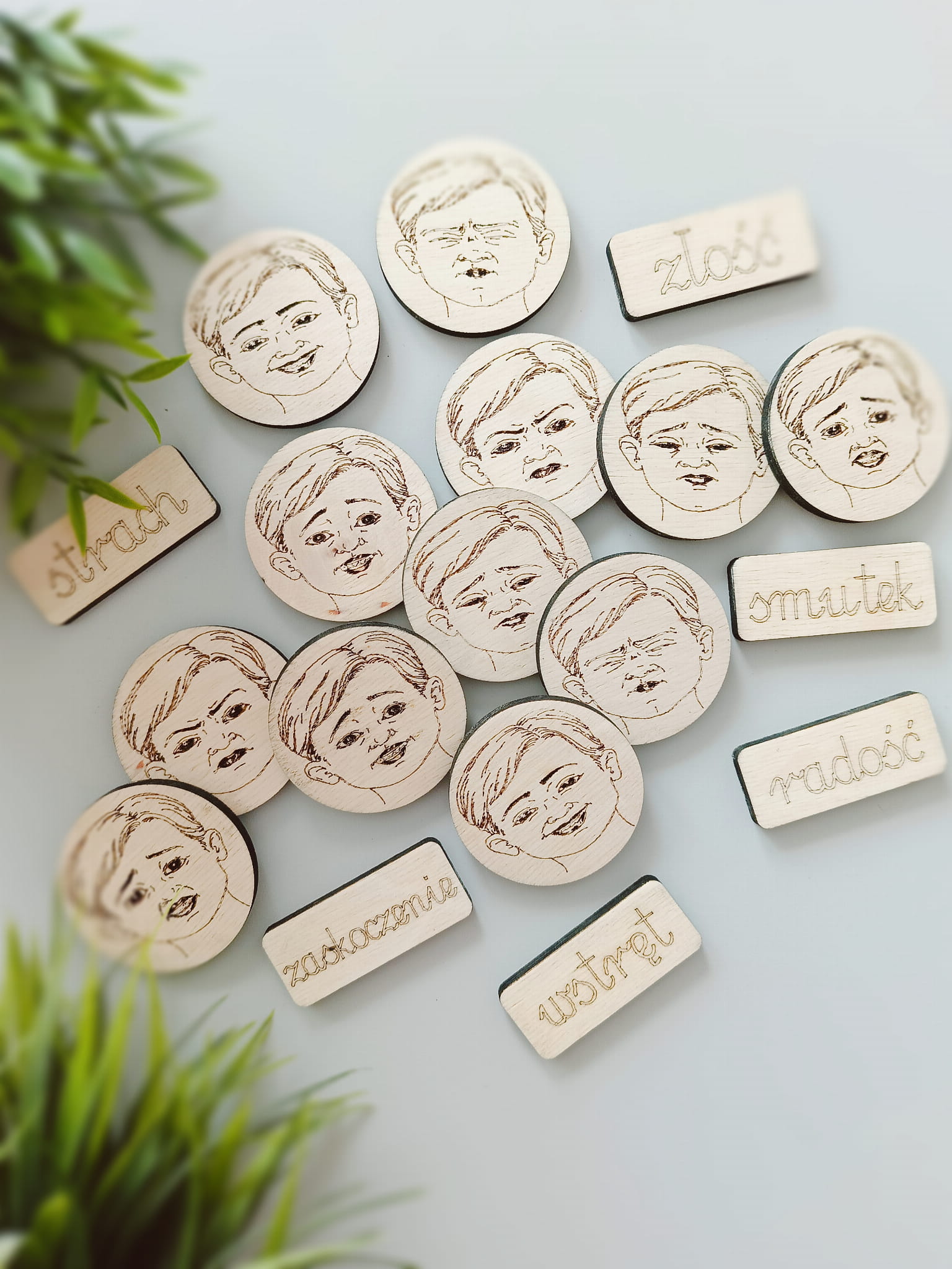 - 6 drewnianych oznaczeń z nazwą każdej emocji