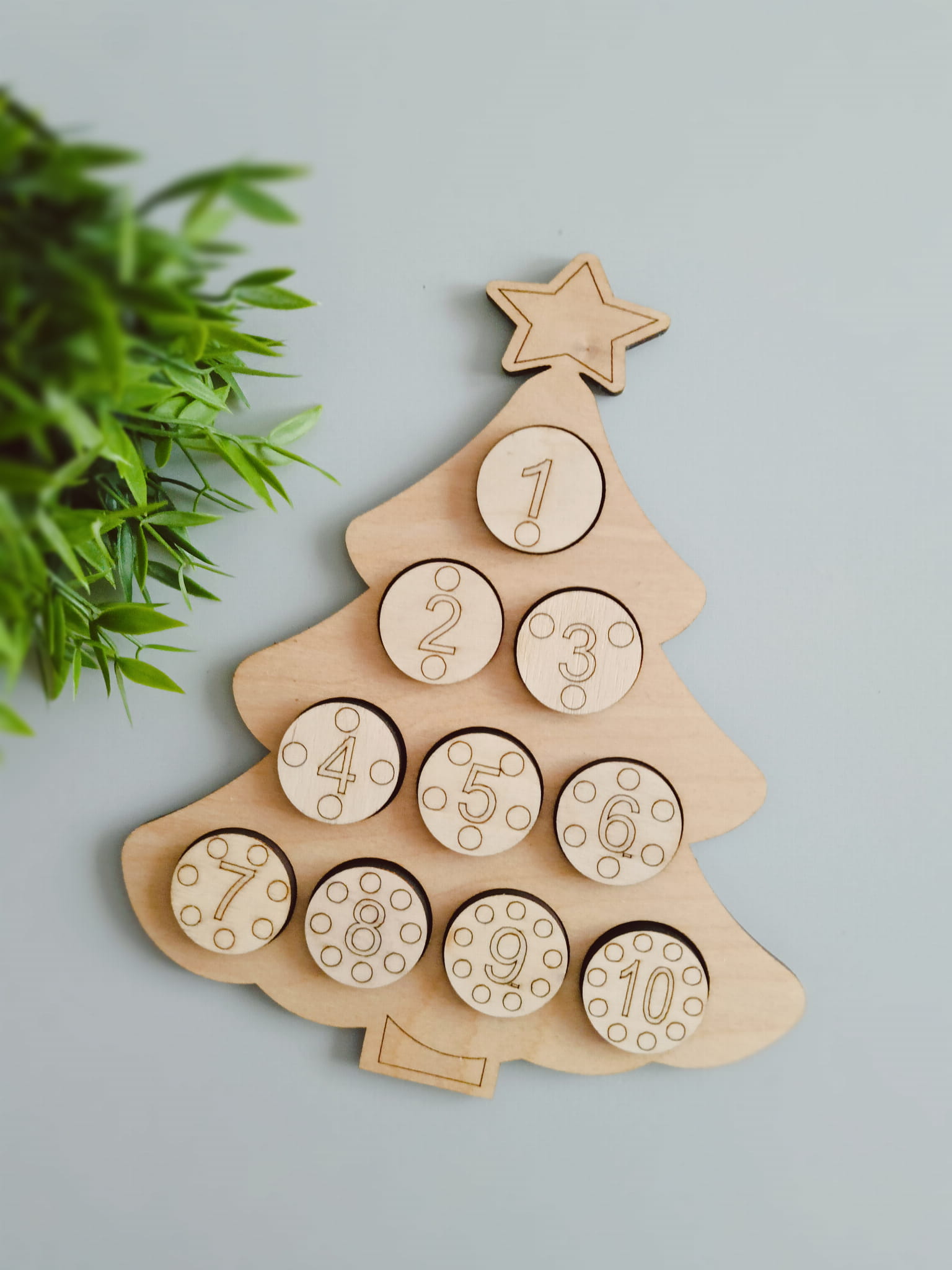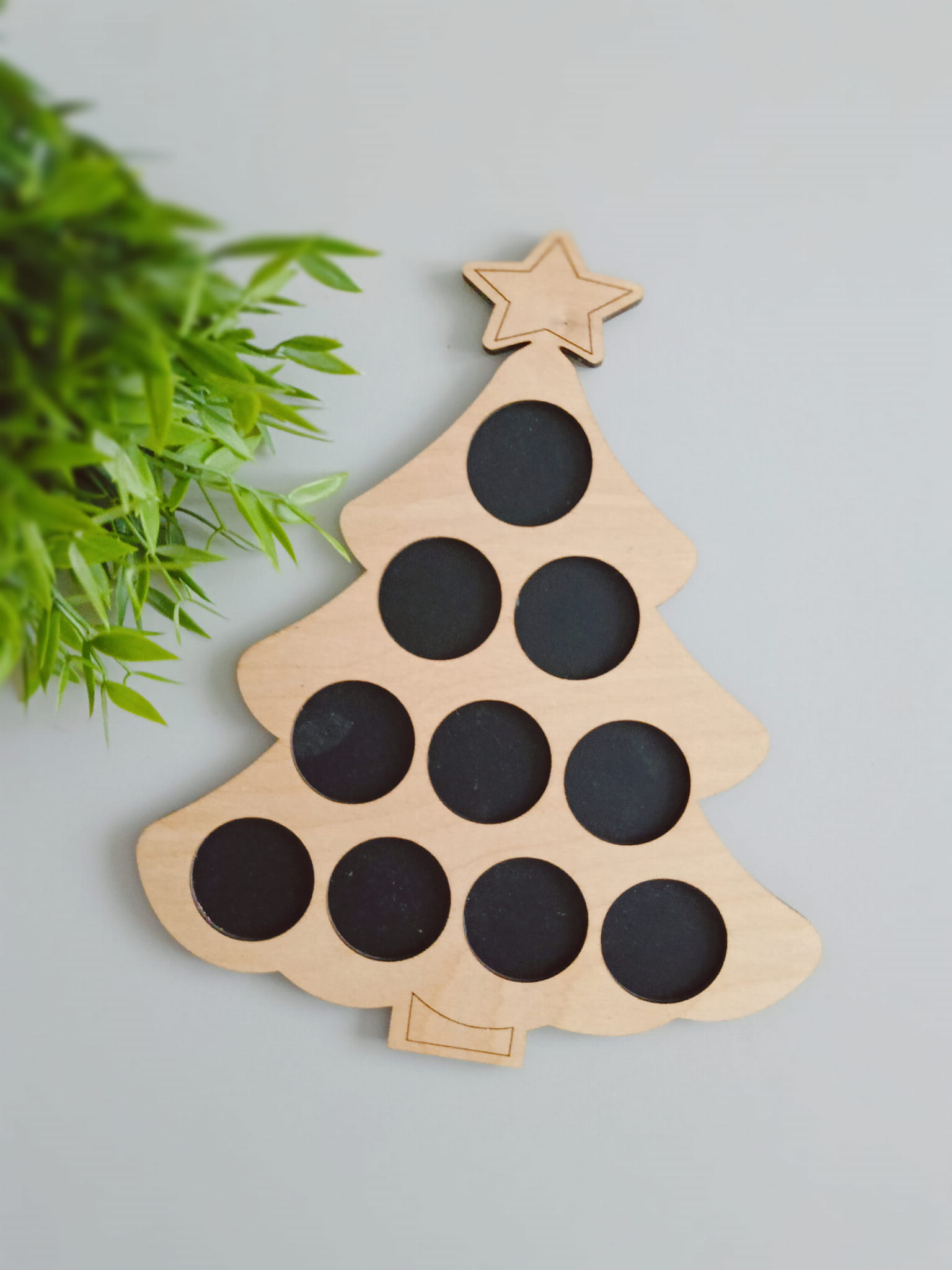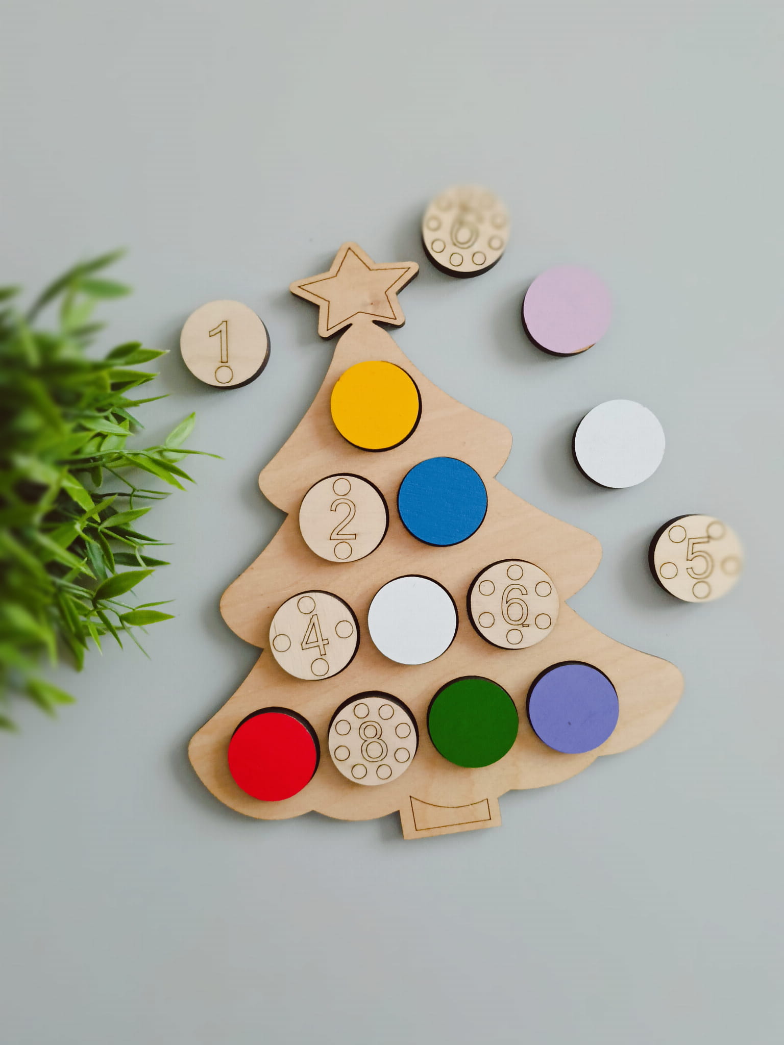 Układanka lewopółkulowa choinka + zestaw drewnianych dwustronnych żetonów.