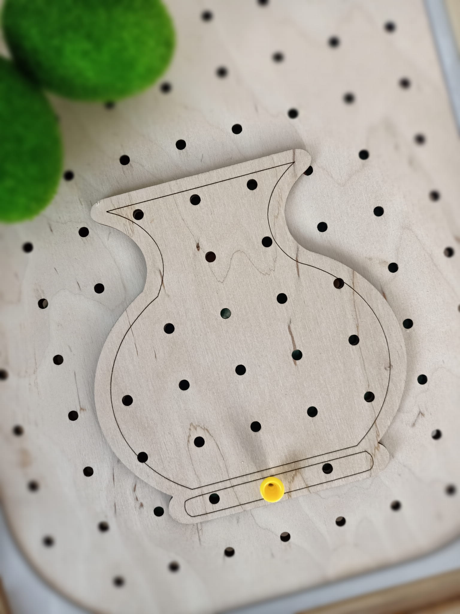 Szablon można wykorzystać z tablicą maxi z wieloma otworami , aby dodatkowo urozmaicić zabawę z tablicą oraz tworzyć kreatywne wzory. Wystarczy położyć szablon na tablicy i w dwóch miejscach zabezpieczyć gwoździkiem, tak aby szablon się nie przesuwał, a następnie wykorzystać np. druciki kreatywne, kolorowe piórka, gałązki, makaron itp. do ozdabiania szablonów.