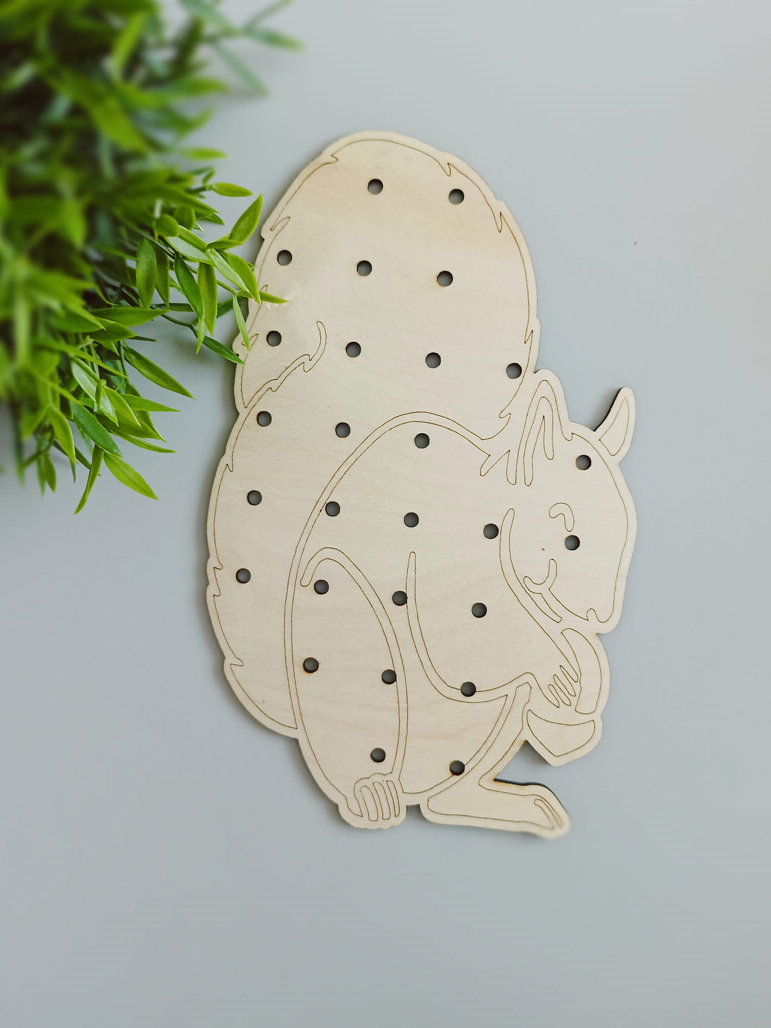 Szablon można wykorzystać z tablicą maxi z wieloma otworami , aby dodatkowo urozmaicić zabawę z tablicą oraz tworzyć kreatywne wzory. Wystarczy położyć szablon na tablicy i w dwóch miejscach zabezpieczyć gwoździkiem, tak aby szablon się nie przesuwał, a następnie wykorzystać np. druciki kreatywne, kolorowe piórka, gałązki, makaron itp. do ozdabiania szablonów.