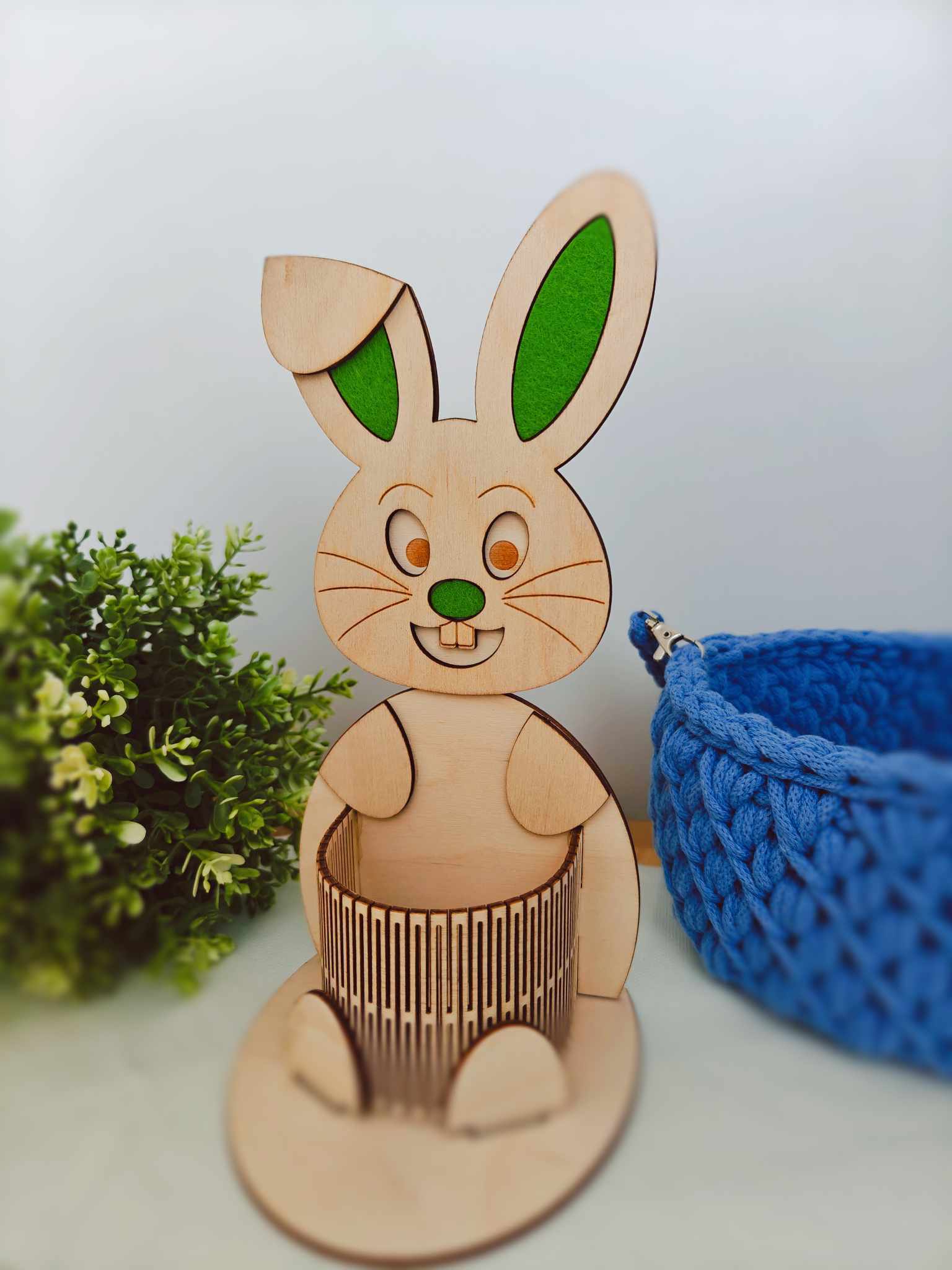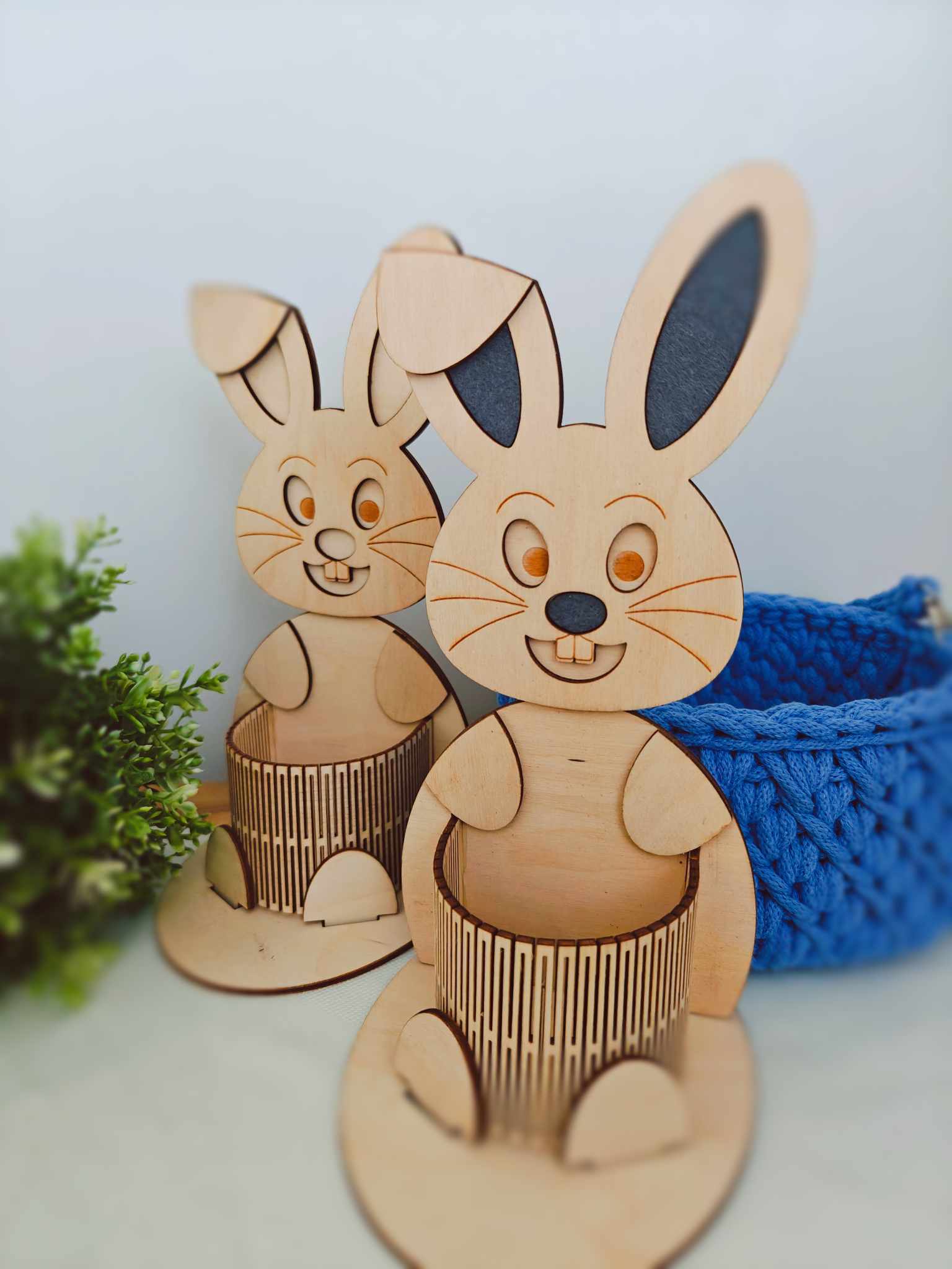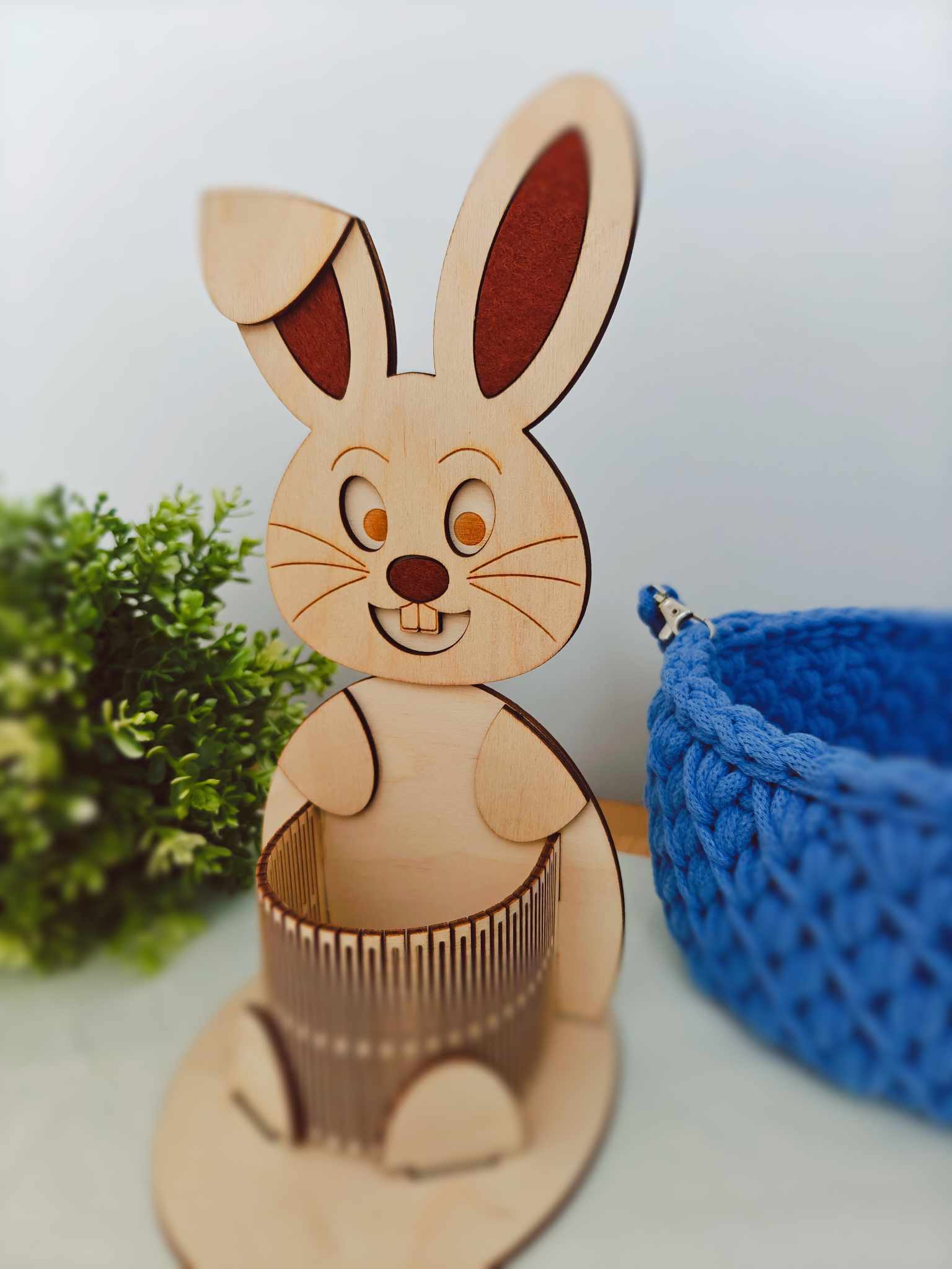 Oryginalny drewniany stojak w kształcie uśmiechniętego zajączka to wielofunkcyjna dekoracja, która świetnie sprawdzi się jako uchwyt na jajko niespodziankę, pisankę lub mały organizer na biurko.