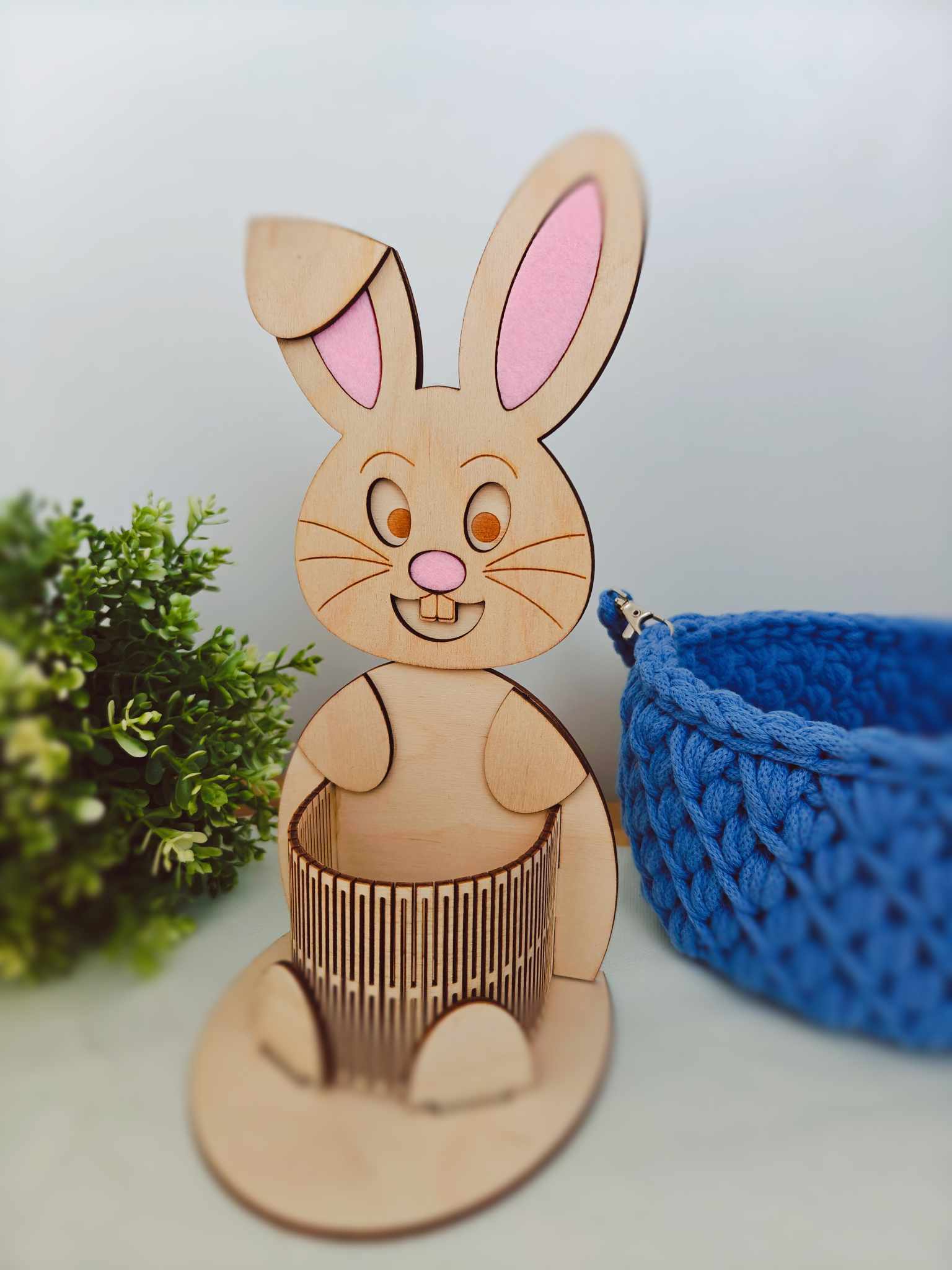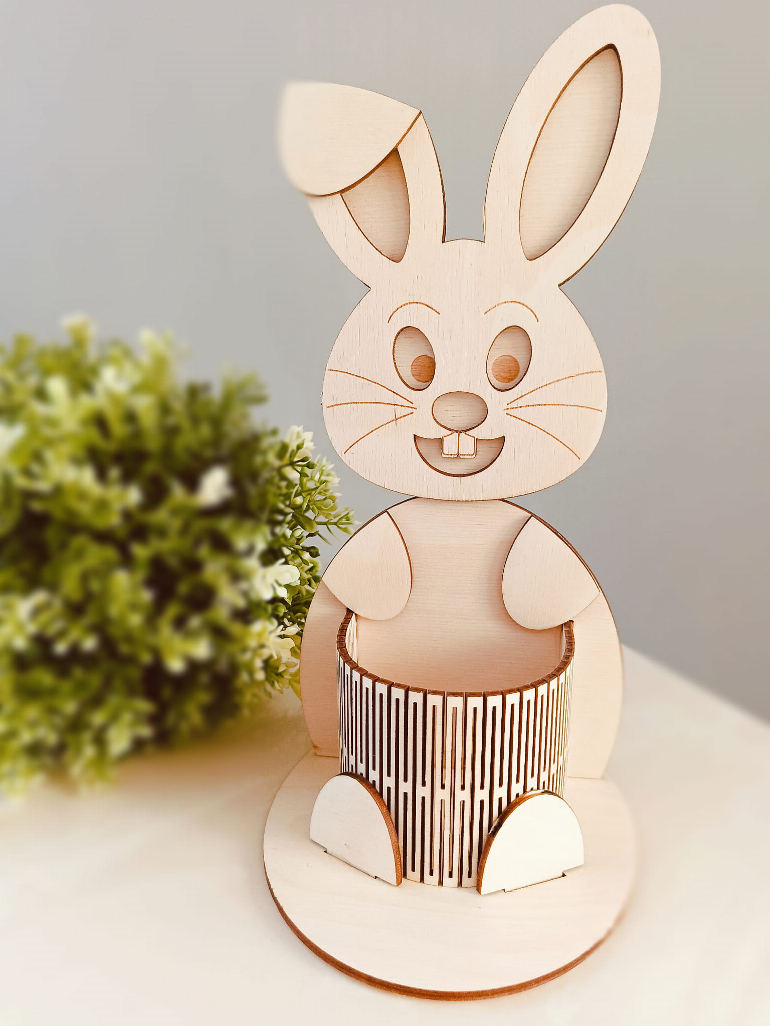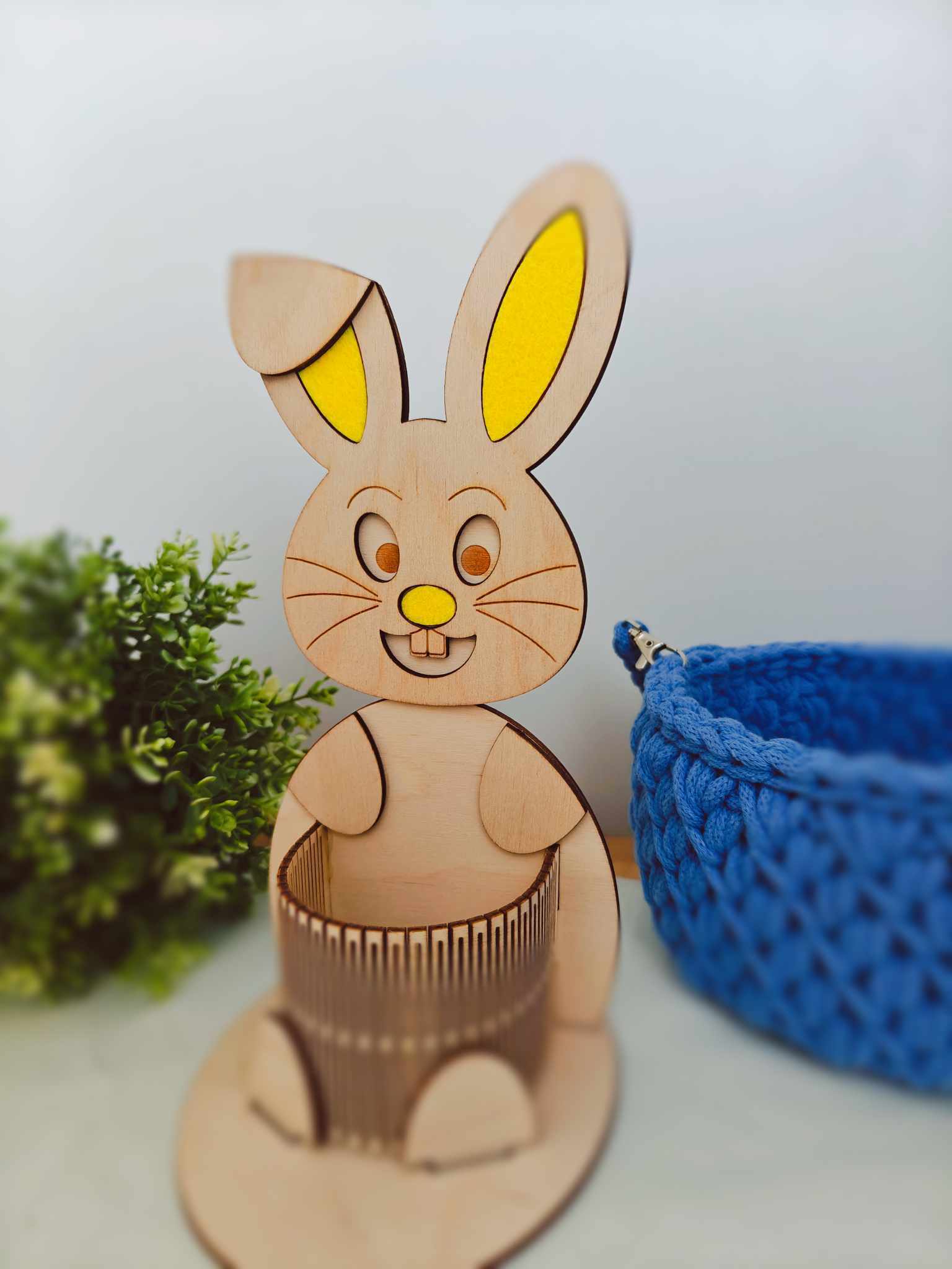 Oryginalny drewniany stojak w kształcie uśmiechniętego zajączka to wielofunkcyjna dekoracja, która świetnie sprawdzi się jako uchwyt na jajko niespodziankę, pisankę lub mały organizer na biurko.