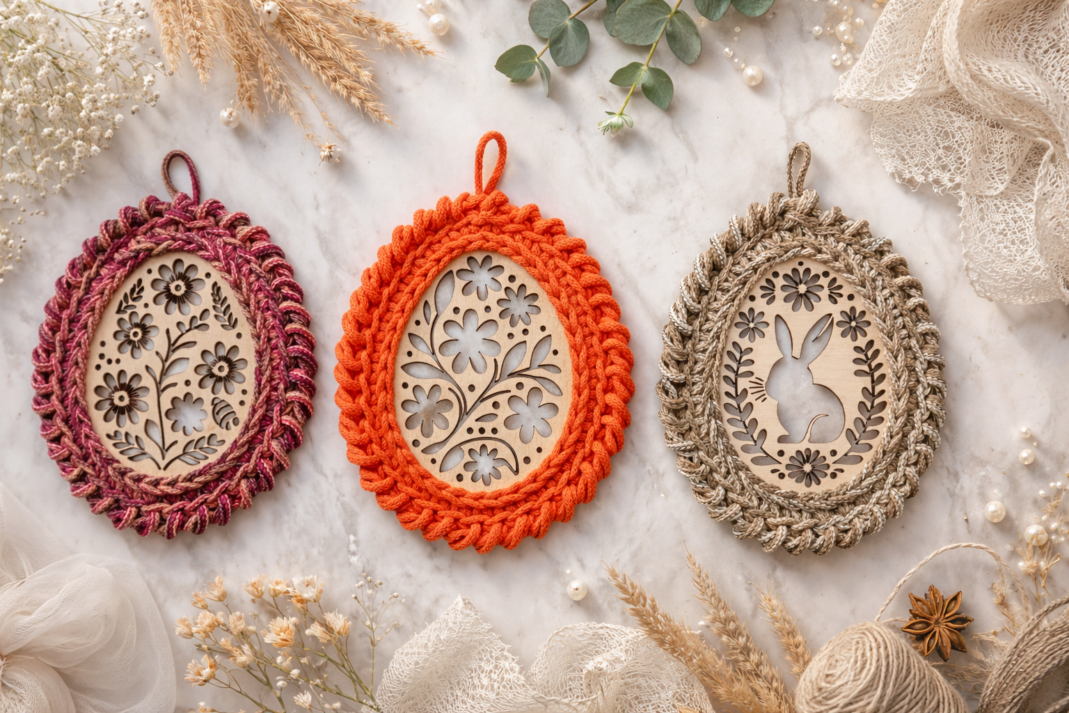 Dekoracja składa się z drewnianych baz z różnymi motywami oplecionych bawełnianym sznurkiem w wybranym kolorze. Idealne do zawieszenia na oknie, ścianie, drzwiach.