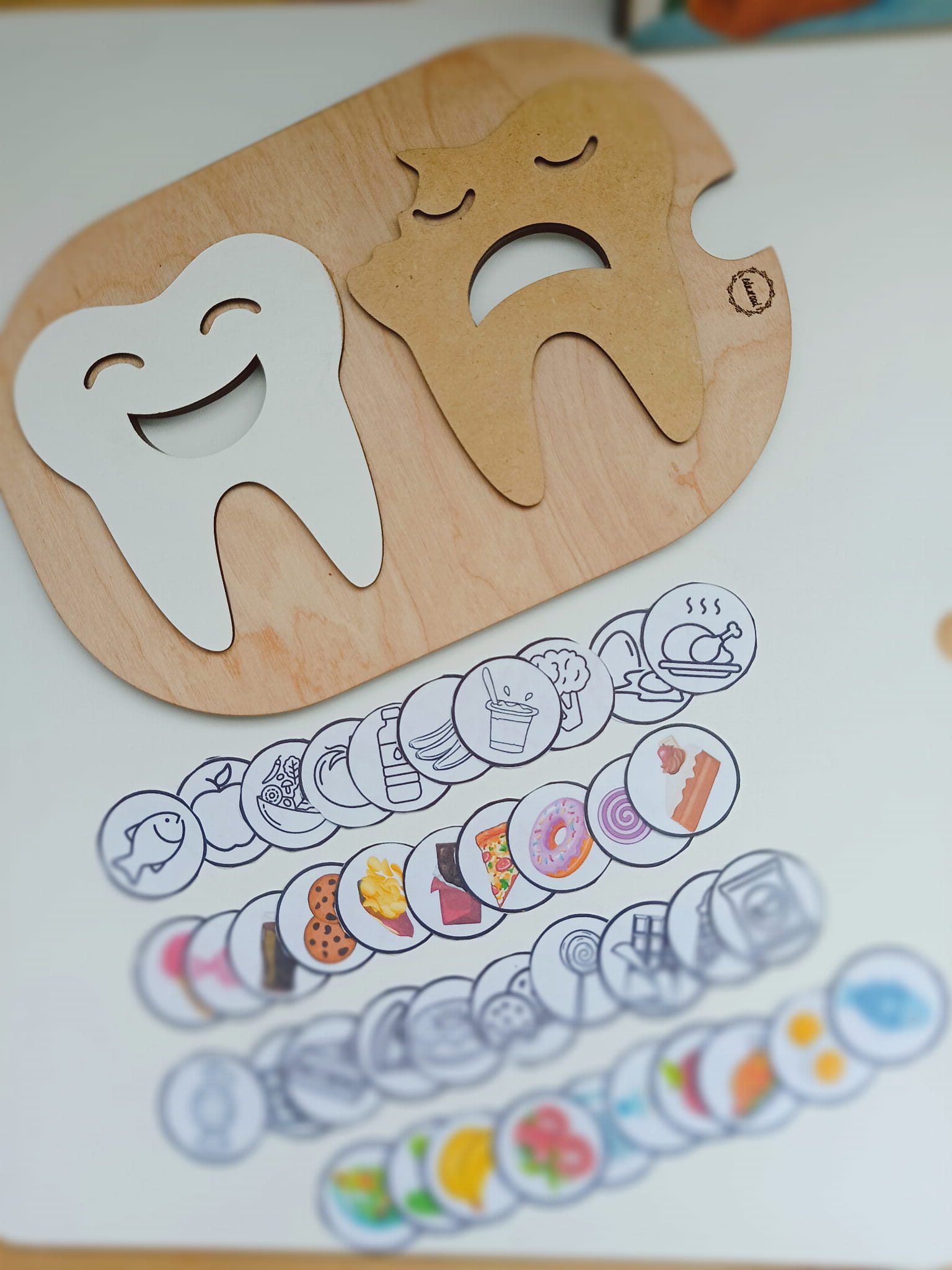 Wariant 2: nakładka + zestaw 20 żetonów z grafikami zdrowego i niezdrowego jedzenia (po 10 żetonów do każdego ząbka). Średnica żetonów 35mm, grubość: 3mm. Dodatkowo plik pdf z grafikami jedzenia (do samodzielnego wydruku- plik zostanie przesłany na adres e-mail podany w zamówieniu po wysyłce fizycznego produktu).
