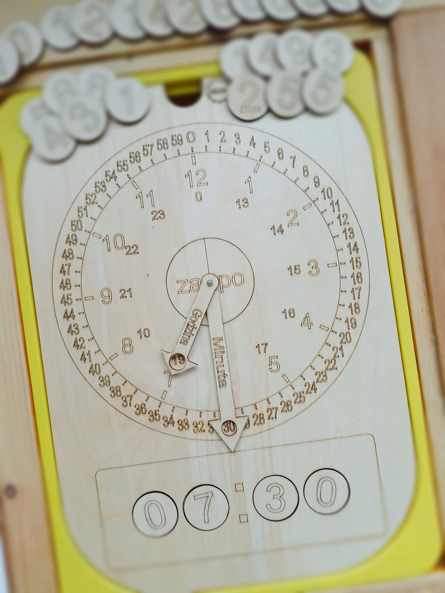 Nakładka do zabawy i nauki odczytywania czasu. Nakładka posiada 2 wskazówki z otworami na zakończeniach - dzięki temu wygodnie można odczytać konkretną minutę oraz godzinę.