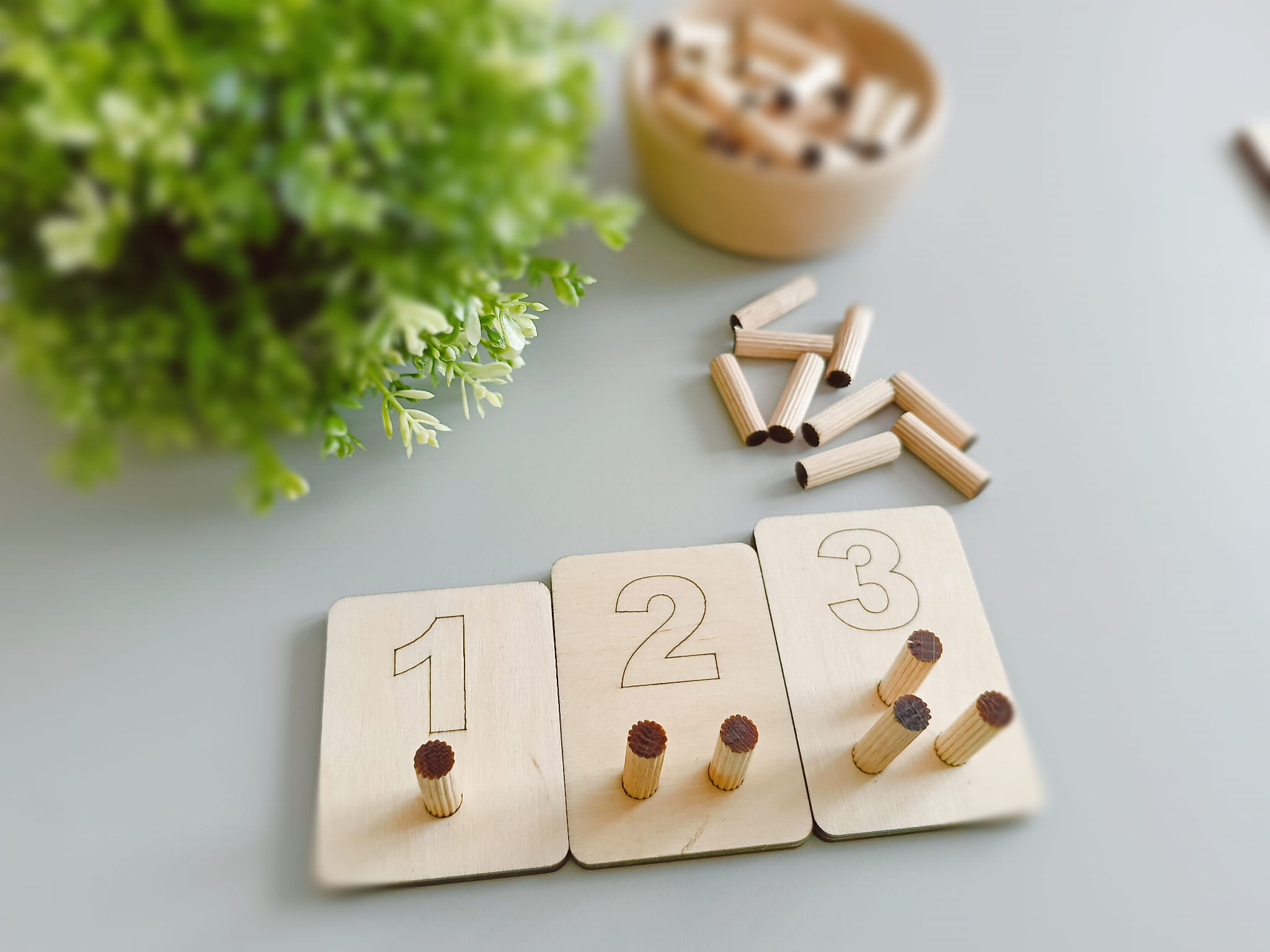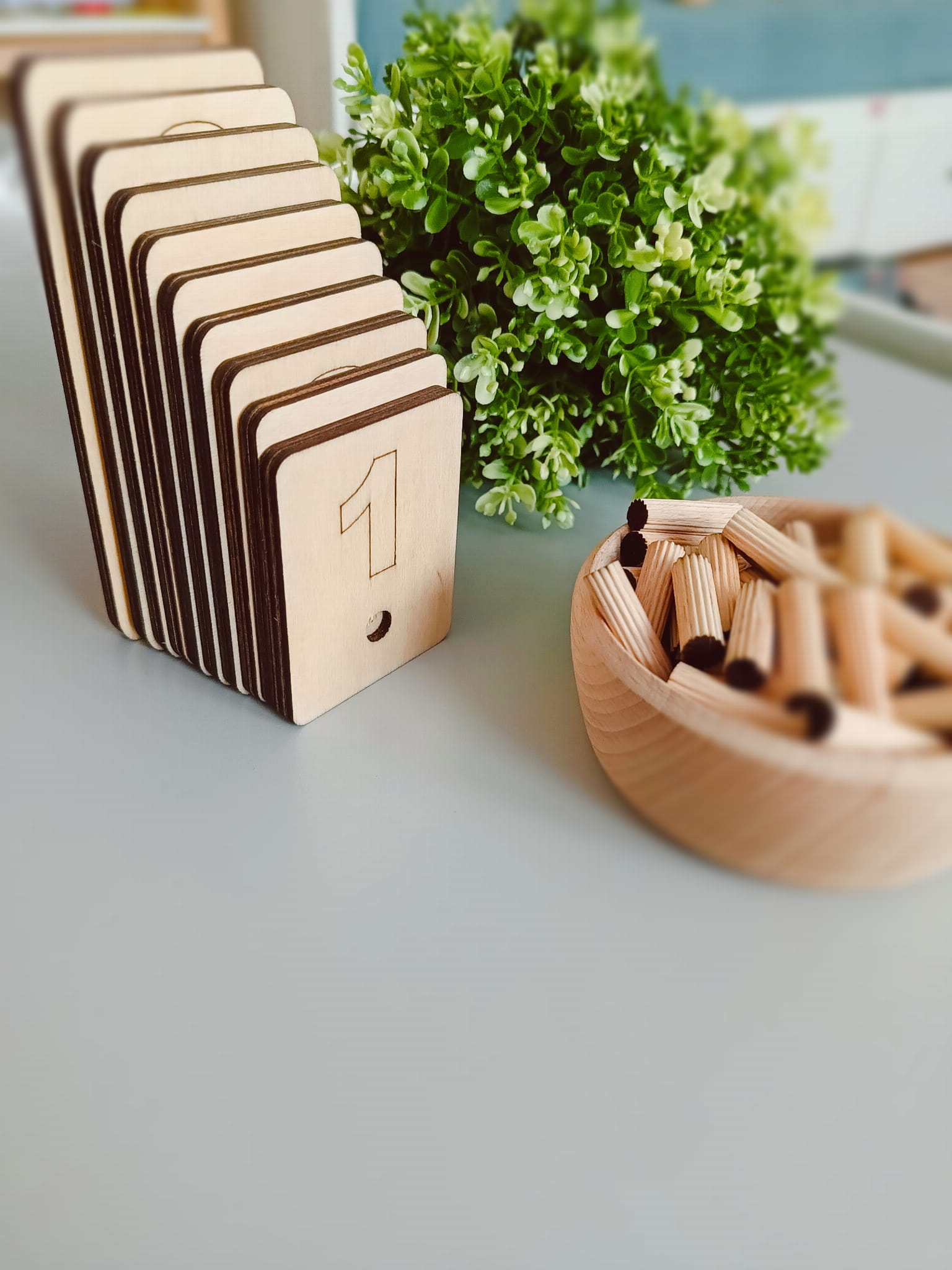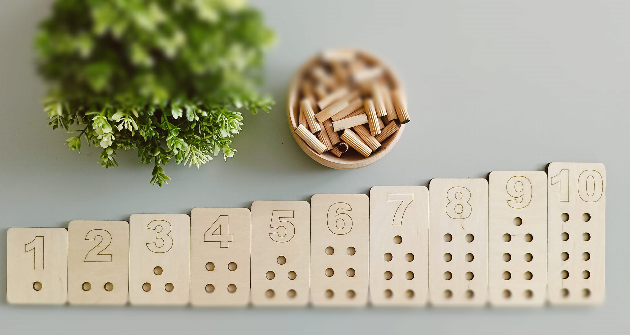 Matematyczna tabliczki od 1 do 10 różnią się ilością otworów - otwory na tabliczkach odpowiadają przedstawionym na nich cyfrom. Dodatkowo tabliczki różnią się od siebie wysokością - każda kolejna tabliczka jest wyższa, dzięki czemu, oprócz przeliczania kołeczków, dzieci mogą je układać od najmniejszej do największej i odwrotnie.